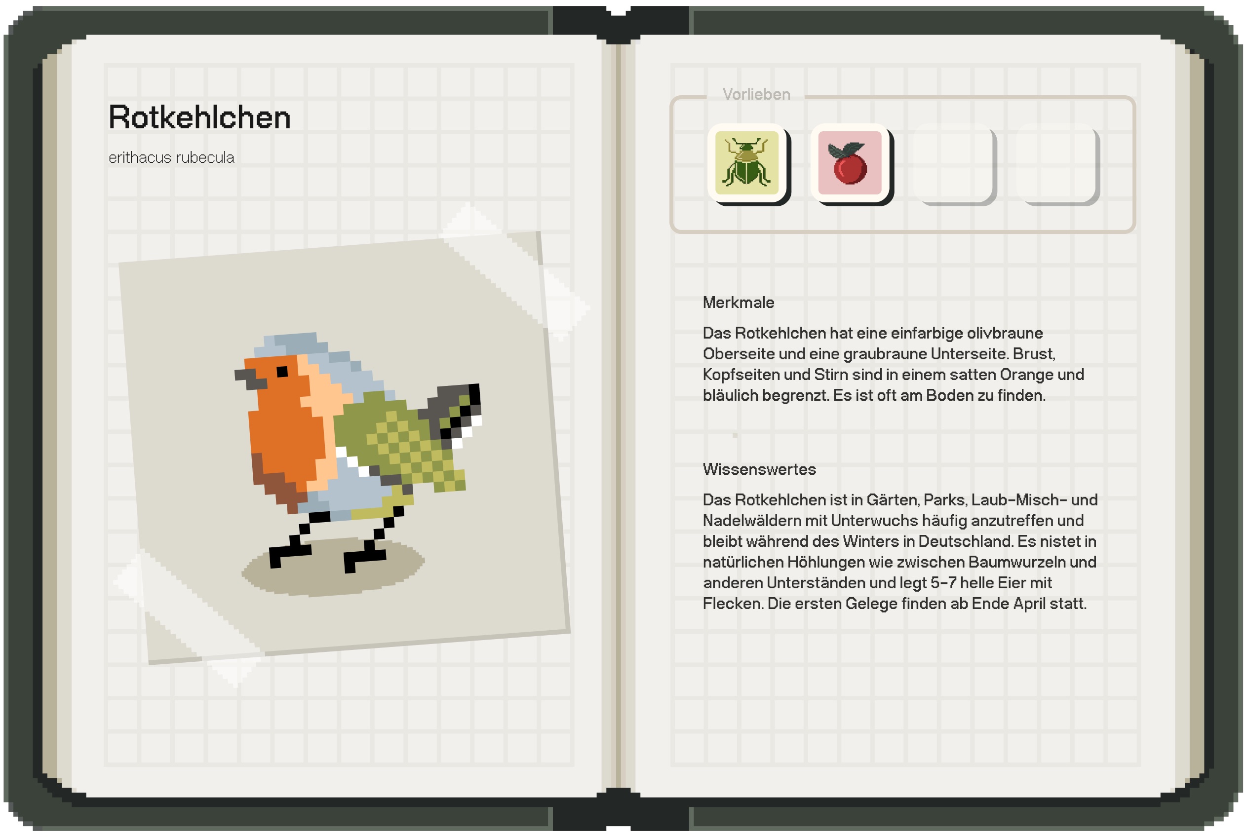During the game, players can unlock various bird-friendly items or plants for their garden, such as birdbaths, perches, deadwood, hawthorn, cinnamon rose, dogwood or wildflower meadows. These attract birds or insects like flies or earthworms and serve as a natural food source for their new feathered friends.