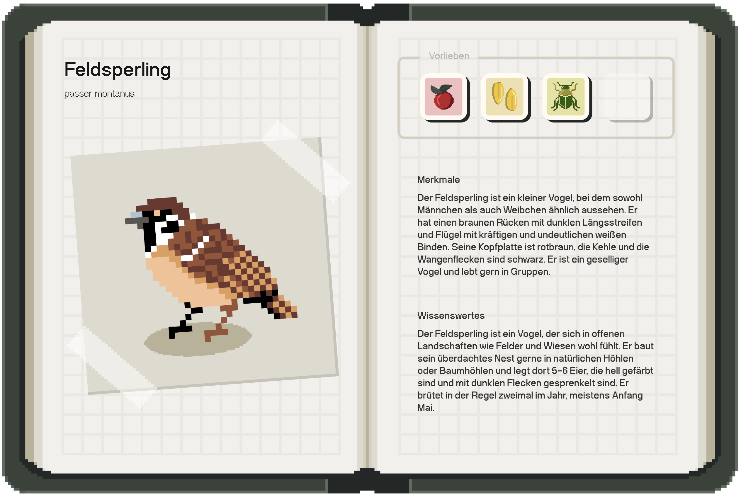 A concept for a game has been created that is intended to develop and foster an affection for native birds among players. This affection is intended to exceed the boundaries of the digital space and motivate players to implement the reliable bird conservation methods learned in the game in real life. The basic concept of the game offers a lot of potential for future expansions, such as adapting the garden to the seasons and adding more bird species. The game can be used both privately and in educational settings, such as biology classes in schools.