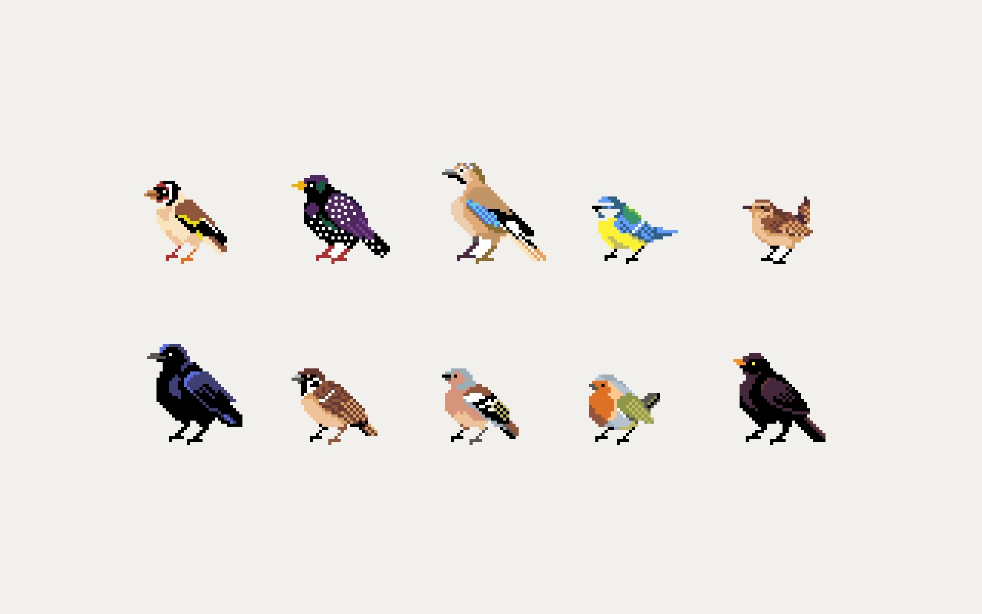 For the prototype, I chose 10 birds to serve as the main characters in the game (from left to right): Goldfinch, Starling, Eurasian Jay, Blue Tit, Wren, Crow, Field Sparrow, Chaffinch, Robin, Blackbird.